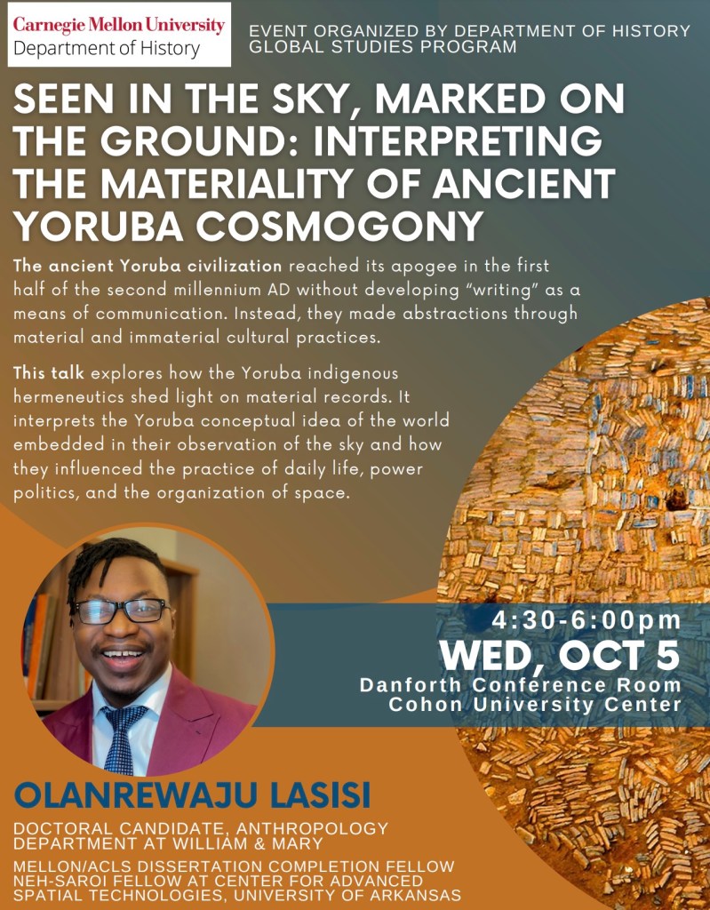 as a means of communication. Instead, they made abstractions through material and immaterial cultural practices. This talk explores how the Yoruba indigenous hermeneutics shed light on material records. It interprets the Yoruba conceptual idea of the world embedded in their observation of the sky and how they influenced the practice of daily life, power politics, and the organization of space.